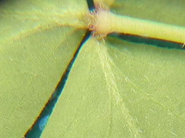 | ▼葉の裏面は脈上や葉面に毛がある。 | ▼茎や葉柄、果柄に白い毛がある。 | |