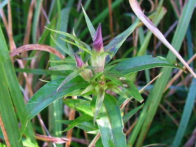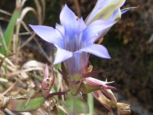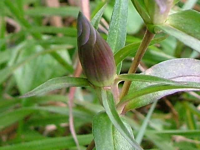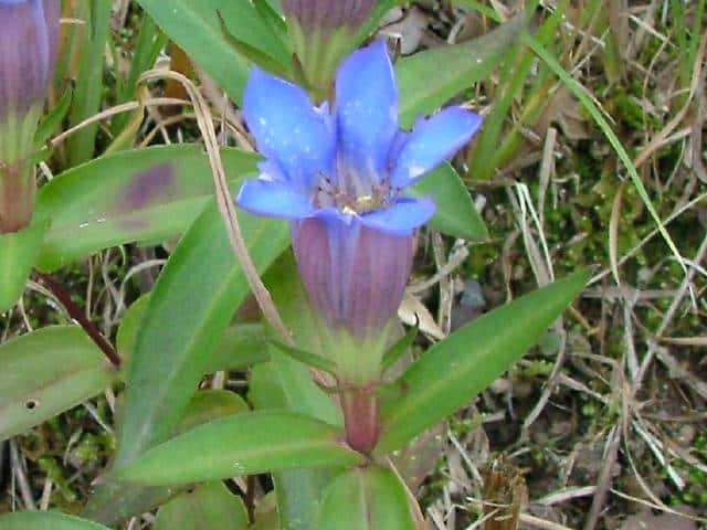 | 多年草 本州〜九州の山野に生える。茎は高さ20〜100cm、直立または斜上し、4条線がある。葉は対生して、卵状披針形、3脈がいちじるしく目立ち、長さ3〜8cm、表面は緑色、裏面は淡緑色、先は長く尖り、基部は丸く、縁には細かい突起があってややざらつき、柄はない。花は茎頂および上部の葉腋にかたまってつき、苞がある。萼筒は長さ10〜20mm、萼裂片は線状披針形で筒部よりやや長いのも短いのもあり、ふつう開出する。花冠は紫色、内面に茶褐色の斑点があり、長さ3〜4.5cm、副片は三角形で小歯がある。子房の基部に5個の蜜腺がある。種子は紡錘形で、両端に短い尾がある。花期は9〜11月。(日本の野生植物) 学名は、Gentiana scabra var. buergeri リンドウ科リンドウ属 |