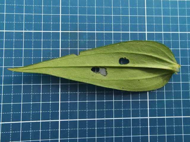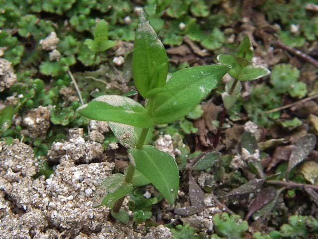 | ▼受粉後、子房が膨らんでくる。 | ▼葉は3脈があり、対生する。 | ▼葉は長さ約10cm。 |