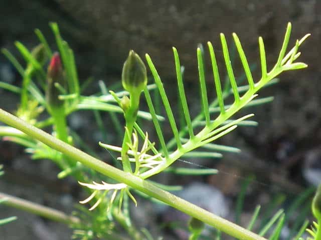 熱帯アメリカ原産。古くから観賞用に栽培され。野生化したものも見られる。葉は互生し、羽状に裂け、裂片は糸状。葉腋に直径約2cmの紅色の花をつける。花冠の上部は5裂して星形に開く。花期は8〜10月。(野に咲く花)
