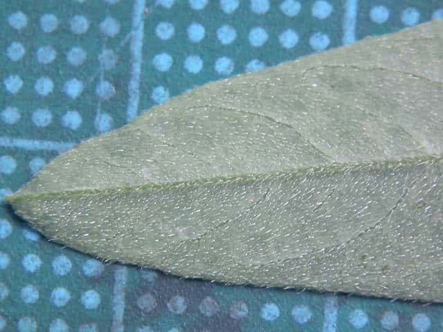 | ▼葉は細い楕円形、長さ約9cm。 | ▼葉の両面に毛が密生する。 | |