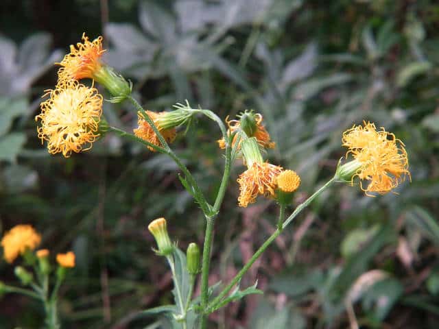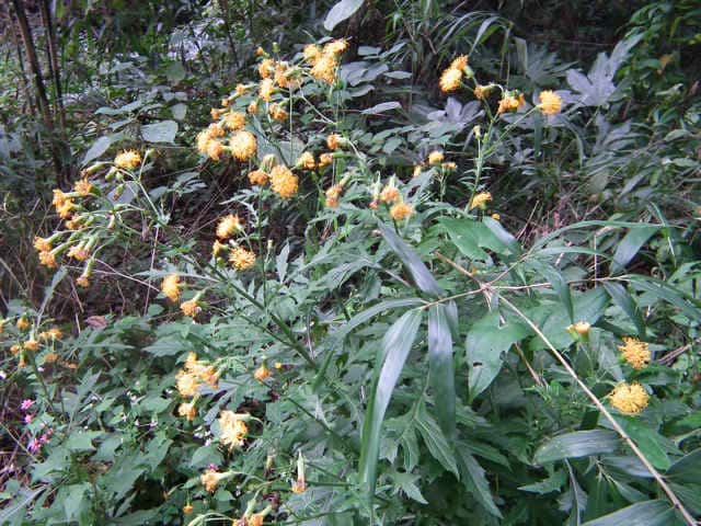 | 多年草 中国の原産。慶長年間に薬草として渡来し、中国地方の山林中などに野生化している。根は肥大し全体に多汁で柔らかい。茎はまばらに短毛を布き、直立して高さ約1.2mになる。葉は卵形〜長楕円形、羽状に1回深裂し、裂片には鋸歯があり、軟質、互生する。茎の頂に黄色の筒状花からなる直径1.5cmほどの頭状花をつける。そう果には白色の冠毛がある。花期は秋。(日本帰化植物写真図鑑) 学名は、Gynura japonica キク科サンシチソウ属 |