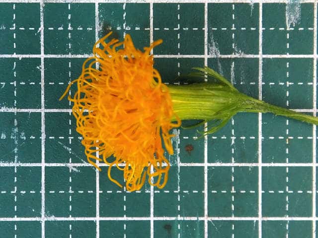 | ▼花は直径約2.5cm。 | ▼花は筒状花だけからなる。 | ▼花の分割面、長い冠毛がある。 |