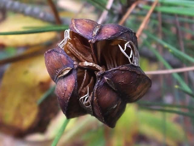 | ▼2014年11月24日 果実 玉湯 | ▼果実は先端から3裂する。 | ▼果実の裂片は格子状の繊維で繋がっている。 |