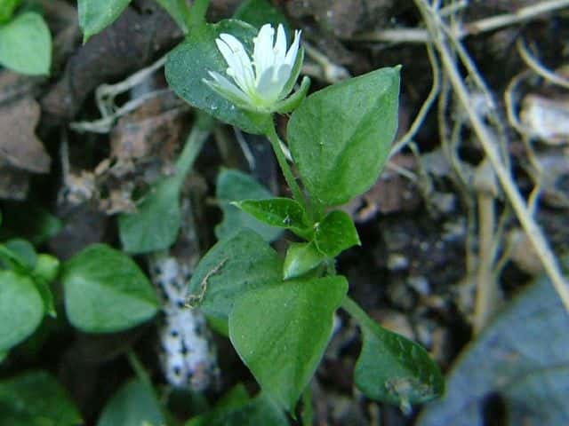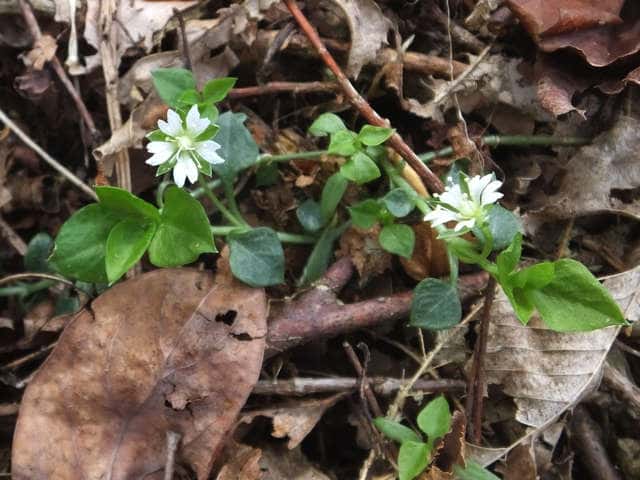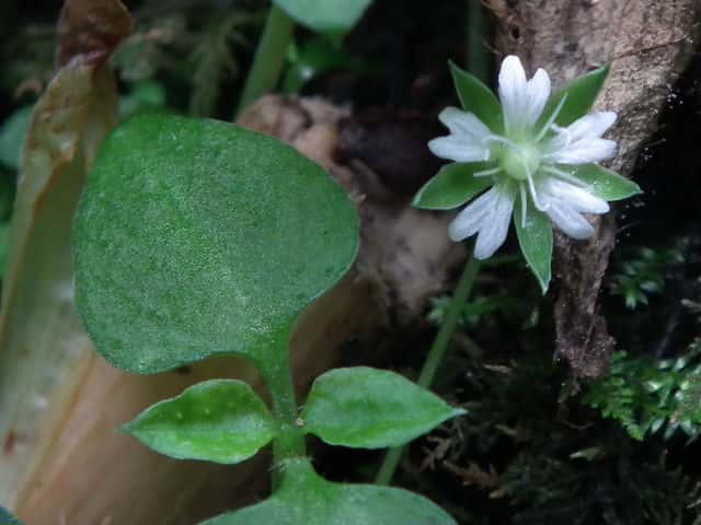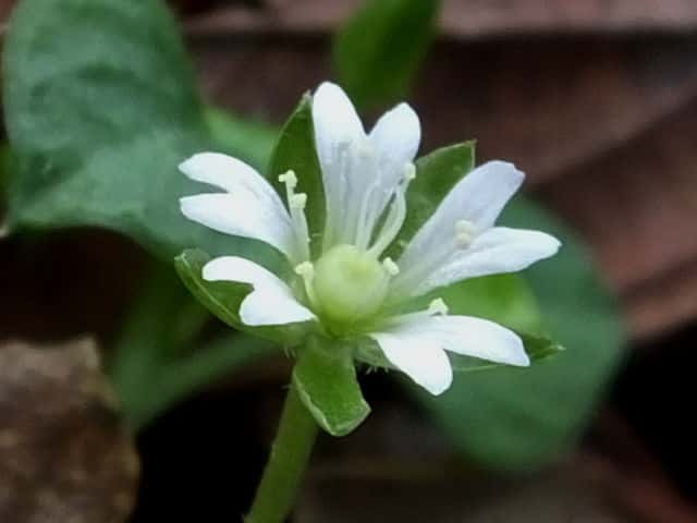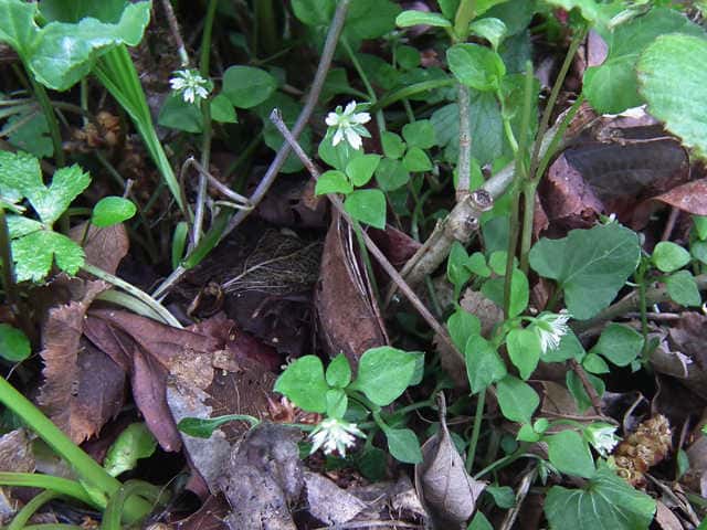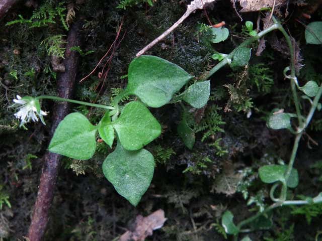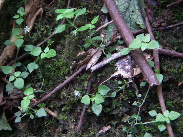 多年草 本州〜九州の山地谷沿いの湿地に生える。茎は地をはい、上部は斜上し高さ10〜30cm、無毛。葉は対生し、三角状卵形で長さ2〜4cm、短毛がある。上部葉腋に柄をだし、直径1〜1.5cmの白花を開く。花弁は5個、先は浅〜中裂する。雄しべは10個。雌しべの柱頭は3個。花糸の基部に毛がある。花期は5〜7月。(山に咲く花) 学名は、Stellaria diversiflora ナデシコ科ハコベ属 |