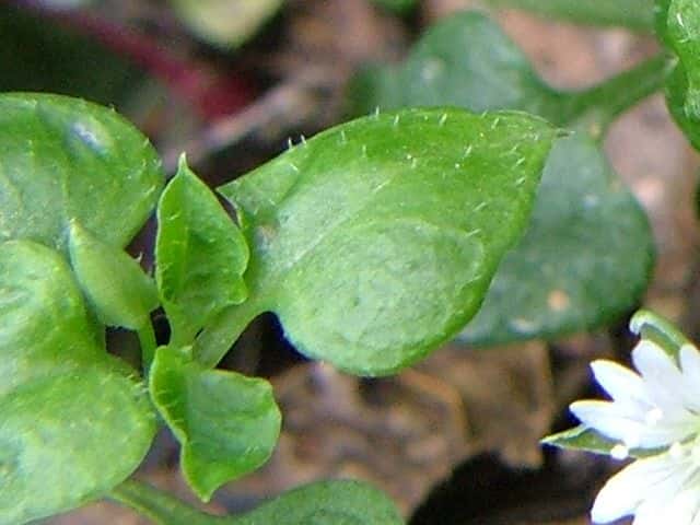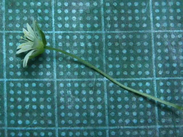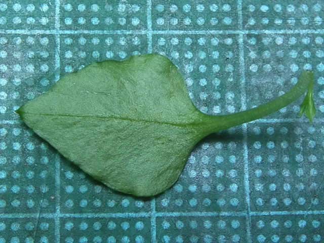 | ▼花柄や葉に毛があり、茎は無毛。 | ▼葉の表面に毛が散生する。 | ▼葉は長さ約2cm。 |