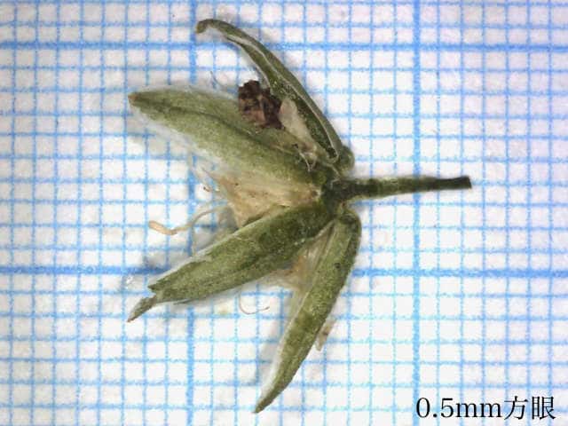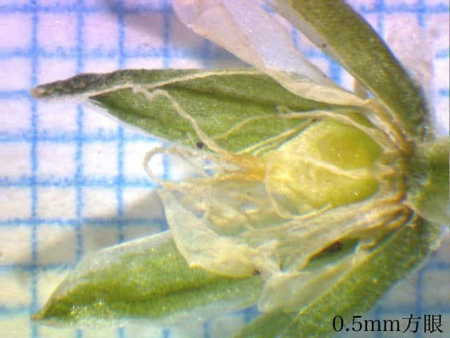 | ▼萼片は長さ約5mm。 | ▼萼に包まれて未熟な果実がある。 | ▼未熟な果実は長さ約1.5mm。 |