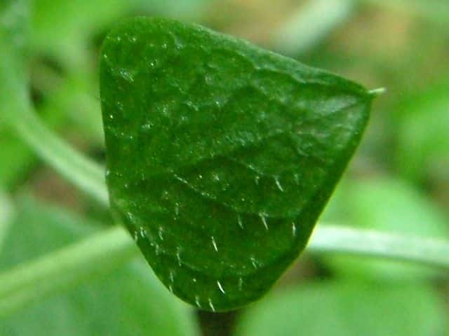 | ▼果実は先端が6裂して種子が出る。 | ▼葉は三角状卵形。 | ▼表面に毛が散生する。 |