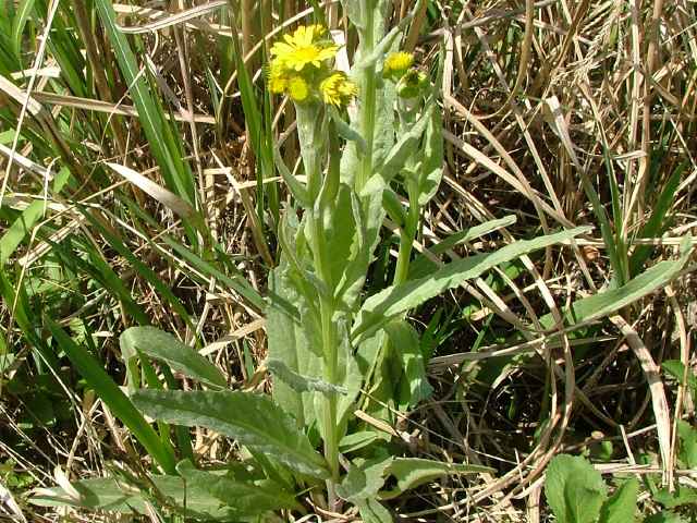 本州〜琉球の山間の湿地に生える。高さ50〜80cm。ときに群生する。茎は太くてやわらかく、中空で直立し、葉とともに白いくも毛がある。根出葉はロゼット状、やや肉質で厚く、花時にも生存し、楕円形〜長楕円形あるいは披針形、長さ12〜25cm、幅1.5〜7cm、鈍頭、縁に微凸歯があるかやや全縁、両面ともはじ密にくも毛があるが、のちに無毛となり、有柄。茎葉は卵状披針形、鋭尖頭、基部は広く茎を抱く。頭花は6〜30個が散房状または散状につき、径3.5〜5cm、頭花の柄は長さ3〜8cm。総苞は筒形、長さ7〜8.5mm、総苞片は広披針形、鋭線形、舌状花冠は長さ11〜16mm、幅2mm。筒状花は長さ13〜18mm。そう果は円柱形、長さ3mm、無毛。冠毛は長さ9〜13mm、雪白色。花期は4〜6月。(日本の野生植物)