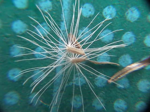 | ▼果実は長さ約1.2mm。 | ▼冠毛には上向きの微細な刺がある。 | |