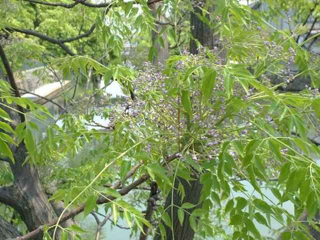 | 落葉高木 四国、九州、沖縄の海岸近くの日当たりのよいところに生える。伊豆半島以西の暖地に野生状態のものが見られ、これを自生とする説もある。ふつう高さ5〜10mだが、大きいものは高さ20m、直径80cmに達するものもある。本年枝は緑色〜暗緑色、太くて皮目が目立つ。関東地方では冬期の寒さで枝の先端が枯死することもある。葉は互生。長さ30〜80cm、幅25〜70cmの2〜3回奇数羽状複葉。葉柄は長さ10〜30cm。小葉は長さ3〜6cm、幅1〜2.5cmの卵状楕円形。先は長くとがり、基部は左右不相称。縁には不ぞろいな鈍い鋸歯がある。はじめ裏面の主脈や小葉の柄に星状毛があるが、のちに無毛。小葉の柄は長さ1cm以下。本年枝の葉腋から長さ10〜15cmの集散花序をだし、淡紫色の花を多数つける。花弁は5個。長さ8〜10mmの倒披針形で平開する。雄しべは10個。紫色の花糸が合着して雄しべ筒をつくる。雄しべ筒の内面には白い毛が生え、先端は細かく切れ込み、内部には黄色の葯がつく。雌しべは1個。雄しべ筒より短い。花柱は円柱状で、柱頭はまるい。萼片は5個。長さ約2mmの卵形で、先端はややとがる。果実は核果。長さ1.5〜2cmの楕円形。10〜12月に黄褐色に熟す。核は楕円形、縦に溝があり、ミカンの袋が集まっているように見える。それぞれの袋には細長い種子があり、春の発芽期にはばらばらになって種子をだす。果実は葉が落ちたあとも枝先に残っていることが多い。花期は5〜6月。 冬芽は、平たい球形。芽鱗は褐色で、灰色〜淡褐色の星状毛が密生する。葉痕はT字形。維管束痕は3個。(樹に咲く花) 学名は、Melia azedarach センダン科センダン属 |