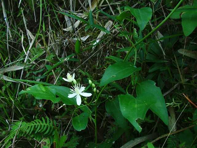 | 常緑つる性半低木 北海道(南部)〜九州の山野の道端に普通。茎は円柱形で肋があり、初めは短毛があって後無毛となる。葉は長柄があり、奇数羽状複葉。小葉は3〜7、卵形または卵円形、鈍頭、微凸端、基部は円形または浅心形、全縁、まれに大きく切れ込み、両面毛を散生し後無毛となり、質はやや厚くて乾いても暗緑色、長さ3〜7cm。小葉柄で物にまといつく。葉腋から円錐花序をだす。花は多数、上を向いて平開する。萼片は4、倒披針形、円頭から鋭尖頭、白色、長さ10〜25mm、ふちに白毛を密布。雄ずいは多数、花糸は長さ7〜9mm、無毛、葯は長さ3mm。そう果は多数、卵形、長さ7〜8mm、扁平で厚いふちがつき、寝た毛がある。花柱は長さ3cm、羽毛状。花期は8〜9月。(原色日本植物図鑑) 学名は、Clematis terniflora キンポウゲ科センニンソウ属 よく似たボタンヅルは葉が3出複葉、雄しべが萼片と同長。蕾の先が丸い。そう果は紡錘形で短毛が密生する。 |