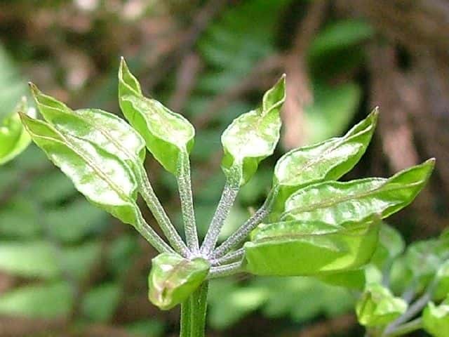| ▼未熟な種子。 | ▼葉は2回3出複葉、葉柄を含めて長さ約22cm。 | |