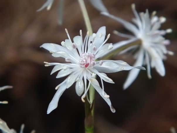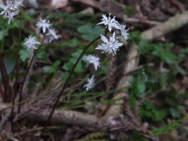 | 多年草 本州、四国の山地に生える。葉は2回3出複葉で、小葉がセリの葉のように切れ込む。花は直径1cmほど。萼片は5〜7個、花弁は8〜10個。雌雄異株。雄花は花弁状の萼片が5個、雄しべが多い。葯は白色。雌花は紫色を帯び、花弁状の萼片5個、へら状の花弁と雌しべはともに10個ほど。花柄などが紫褐色を帯びる。花期は3〜4月。(山に咲く花) 学名は、Coptis japonica var. major キンポウゲ科オウレン属 |