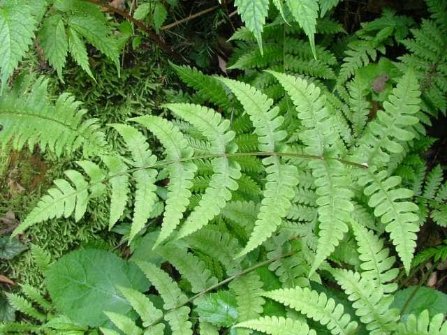| 夏緑性シダ植物 本州〜九州の林下の湿った所に生える。根茎は這う。葉柄はやや紫紅色を帯びて淡褐色の鱗片がまばらにつき、基部鱗片は広披針形、褐色。葉身は1回羽状複葉で、下部の羽片の裂片は上下でほぼ互生、無柄。切れ込みの深い小羽片の基部は羽軸に流れて翼をつくる。中軸と羽片の分岐点には肉刺状の突起がある。羽軸は無毛。羽軸表面に刺状の突起が出る。ソーラスは細楕円形で、中肋と辺縁の中間かやや中肋寄りにつき、包膜はない。 学名は、Cornopteris decurrentialata イワデンダ科シケチシダ属 |