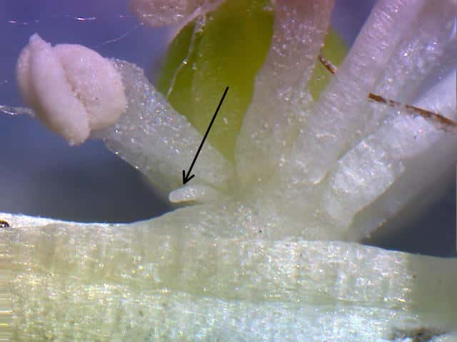 | ▼2015年6月7日 短い2個の花被片 西長江 | ▼雄しべの基部に長さ約0.1mmのごく小さな突起片があり、これが短い2個の花被片なのだろうか。 | |