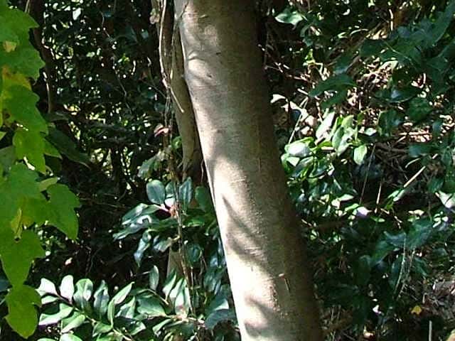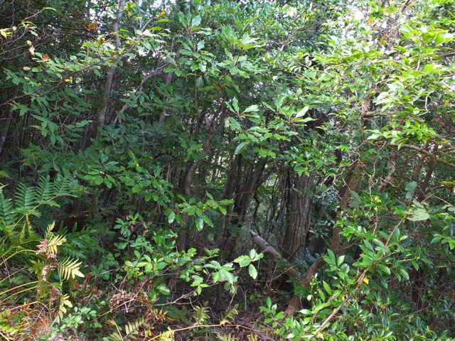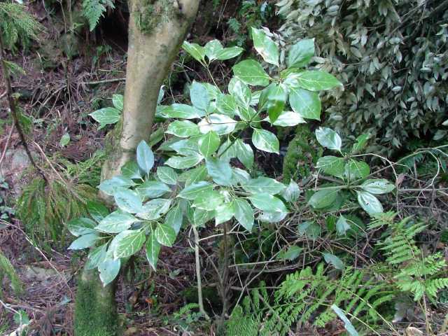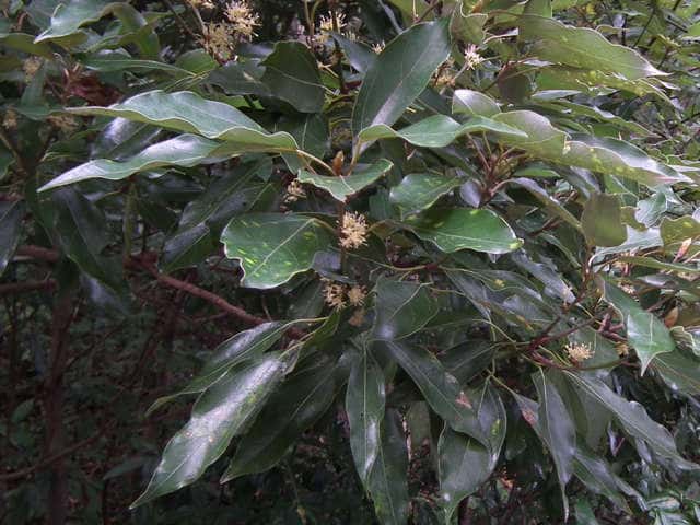 | 常緑高木 宮城・山形県〜沖縄の暖地の山野の比較的湿潤なところに生える。高さ10〜15mになる。樹皮は緑色を帯びた暗褐色。まるい小さな皮目が多い。新枝には黄褐色の毛が密生する。葉は互生。枝の先に集まってつく。葉身は長さ8〜18cm、幅4〜8cmの長楕円形または卵状長楕円形で、全縁。3脈が目立つ。若葉は垂れ下がり、両面とも黄褐色の絹毛におおわれる。成葉になると表面は無毛。裏面はロウ質におおわれて灰白色。多少絹毛が残る。葉柄は長さ2〜3cm。雌雄別株。葉のわきに黄褐色の小さな花が集まってつく。総苞片は広楕円形。花被片は4個。雄花の雄しべは6個。葯は4室、内面に2室、左右に2室ある。雄花にも雌しべがあるが結実しない。雌花には雌しべが1個と仮雄しべが6個ある。花被片は4個あり、平開する。葯のない棒状の仮雄しべと黄色い腺体がある。果実は液果。長さ1.2〜1.5cmの楕円形で、翌年の10〜11月に赤く熟す。種子は球形。花期は10〜11月。 冬芽の葉芽は長楕円形で先端は尖る。花芽は球形で無柄。(樹に咲く花) 学名は、Neolitsea sericea クスノキ科シロダモ属 果実が黄色く熟すものをキミノシロダモという。 |