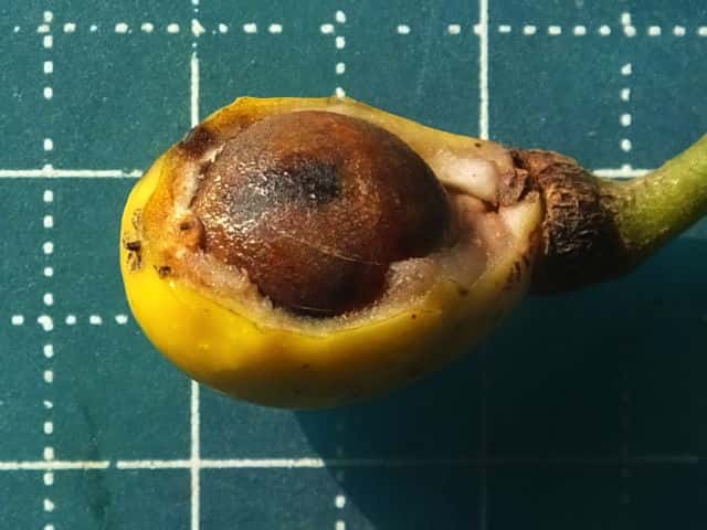 | ▼果実は長さ約1.3cm、幅約1cmの楕円形。 | ▼果実の横断面、種子が1個入る。 | |