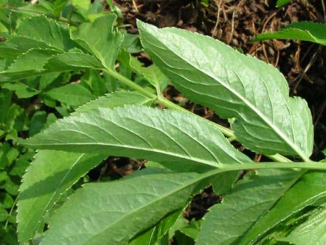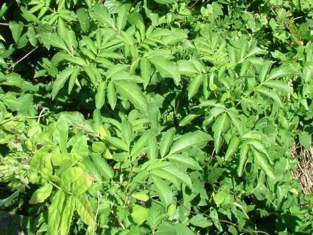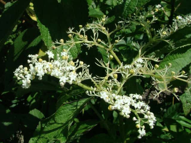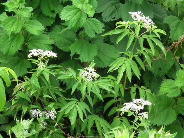 | 多年草 本州〜九州の山野や人家のそばなどに生える。高さ1〜1.5m。葉は大型の奇数羽状複葉で対生する。小葉は5〜7個で長さ5〜17cmの広披針形または狭卵形。茎の先に白い小さな花をびっしりとつける。花冠は深く5裂して、皿のように開出する。花には蜜はなく、花序のところどころにある黄色の腺体に蜜をためる。花序の上部は平ら。果実は直径約4mmの球形で赤く熟す。花期は7〜8月。(野に咲く花) 学名は、Sambucus chinensis ガマズミ科ニワトコ属 |