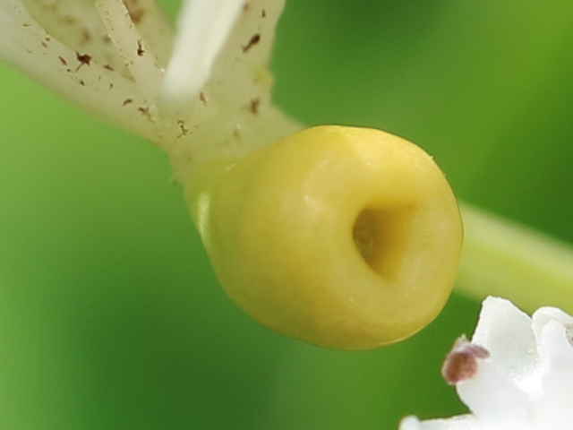 | ▼若い果実は長さ約3mm。 | ▼果実の先端に小さな萼が残る。 | |