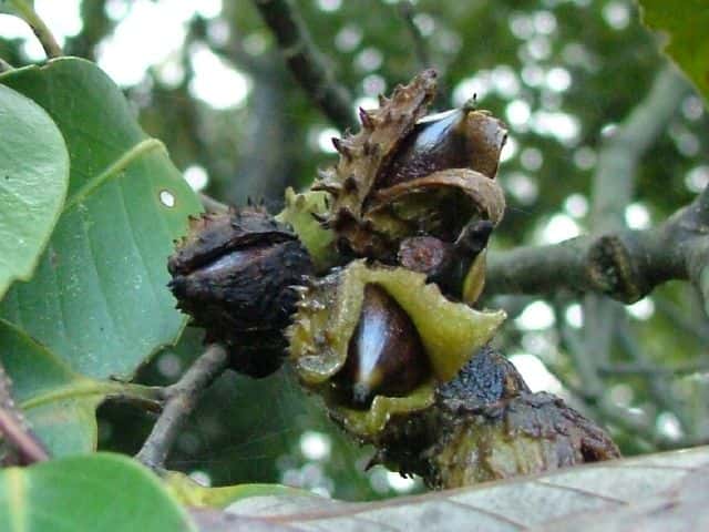 | ▼2013年10月21日 落下した果実 玉湯 | ▼3裂した殻斗に包まれた果実。 | ▼殻斗を1一部除いた。 |
