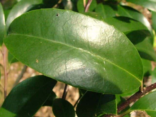 | ▼2017年11月13日 鋸歯のある葉。 宍道 | ▼葉先は長く尖り、捩れている。 | ▼裏面は光沢がある。 |