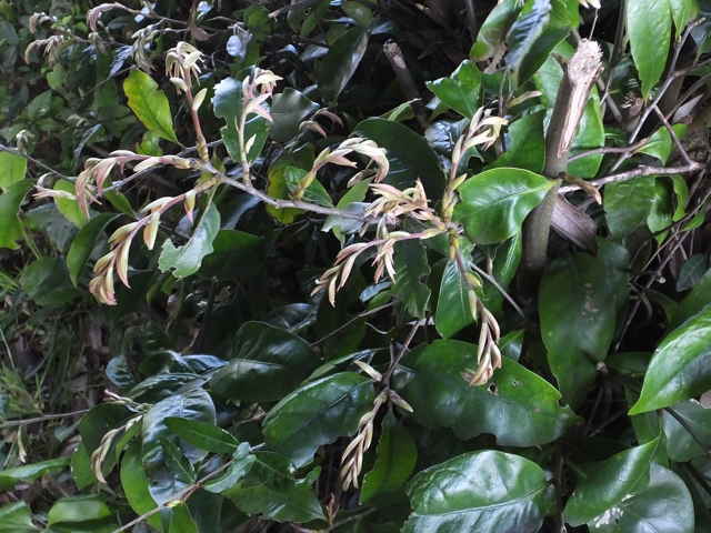 | 常緑高木 福島・新潟県以西〜九州の山地に生える。高さ約20m、直径1mほどになる。幹は上方でよく分枝して、まるみのある大きな樹冠をつくる。樹皮は黒褐色。大木になると縦に深く裂け目が入る。新枝は褐色を帯びた灰緑色。円形の小さな皮目が多い。葉は互生。2列に並び、やや斜めの下向きにつく。葉身は長さ5〜15cm、幅2.5〜4cmの広楕円形で、厚い革質。先端は急に細くなって尾状に長く伸び、基部は広いくさび形。全縁または上半部に波状の鋸歯が少しある。表面は光沢のある深緑色、はじめ淡褐色の細かい垢状の毛が散生するが、まもなく無毛になる。裏面には灰褐色の細かい垢状の毛が密生する。葉柄は長さ1cmほど。托葉は開葉後まもなく落ちる。雌雄同株。虫媒花なので、花期には強い香りを発散する。雄花序は長さ8〜12cm、新枝の下部から上向きに伸びるが、花序の軸が繊細なので先端は垂れる。雄花は膜質の苞の脇に普通1個つく。花被は直径3mmほどの半球形。雄しべは10〜12個。雌花序は長さ6〜10cm、新枝の上部の葉腋から直立し、雌花が多数つく。雌花の基部は直径約1cmの椀状の総苞に包まれる。花柱は3個。果実は堅果。長さ1.2〜2cmの卵状長楕円形で、翌年の秋に成熟する。堅果ははじめ殻斗に包まれているが、成熟すると殻斗は3裂し、中から堅果が顔を出す。殻斗の外面には鱗片が同心円状に並ぶ。花期は5〜6月。 冬芽は、やや扁平な長楕円形。(樹に咲く花) 学名は、Castanopsis sieboldii ブナ科シイ属 よく似たツブラジイ(コジイ)は堅果が長さ6〜13mmと小さく、樹皮に深い割れ目ができない。 |