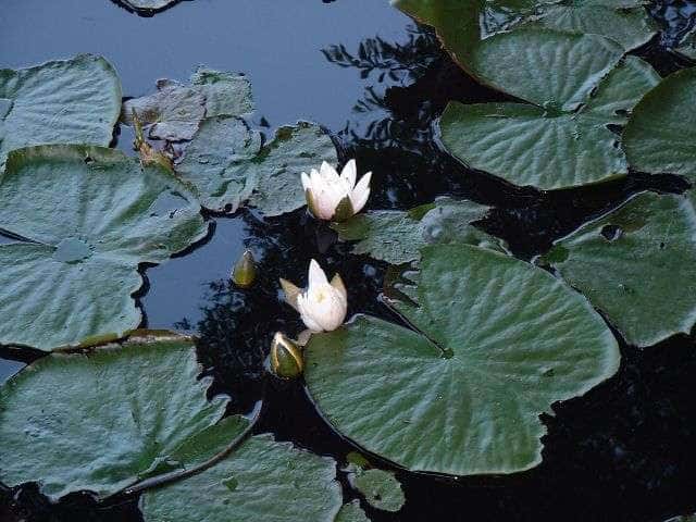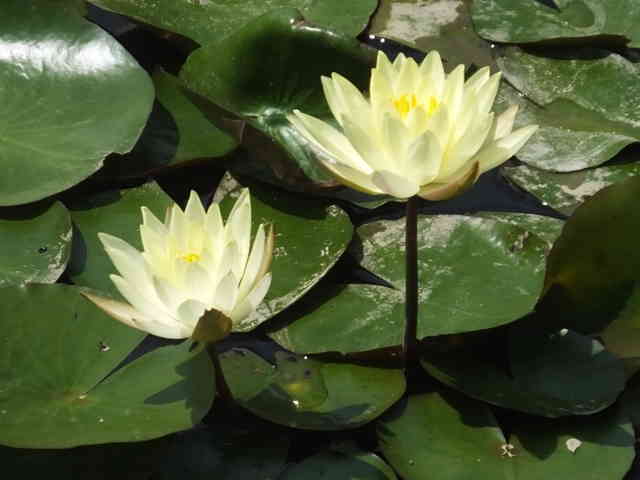 | 多年草 栽培されていたものが逸出、またはため池などに植裁されたものがある。浮葉は在来のヒツジグサと比べ一回り大きく、約30cm前後、円形、全縁、基部は葉柄の付け根まで切れ込む。花は白色か紅色、花弁は多数。栄養条件が良いと浮葉で水面を覆いつくし、さらには水面上にまで葉を立ち上げて抽水状態でも生育する。花期は6〜9月。 学名は、Nymphaea spp. スイレン科スイレン属 |