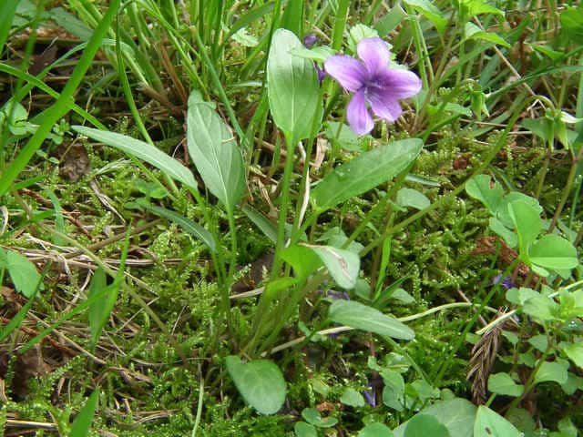 | 多年草 日本全土の人家付近から丘陵まで日当たりのよいところにふつうに生える。根は黄赤褐色で太い。高さは7〜11cm。葉は束生し、花期には長さ2〜9cmの長楕円状披針形で、先はまるい。葉柄には広い翼がある。夏の葉は大きく三角状披針形。花は大きく、ふつう濃紫色だが、白花品もある。花弁は長さ1.2〜1.7cm。側弁には白い突起毛がある。距は長さ5〜7mm。柱頭はカマキリの頭のようにふくらむ。花期は4〜5月。(野に咲く花) 学名は、Viola mandshurica スミレ科スミレ属 海岸型の変種で葉が厚くて光沢がある2変種があり、日本海側に分布するものをアナマスミレといい、太平洋側のものをアツバスミレという。 スミレの分類 |