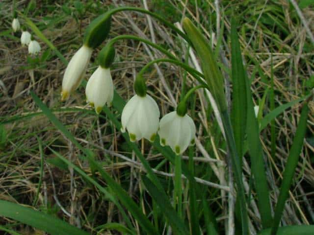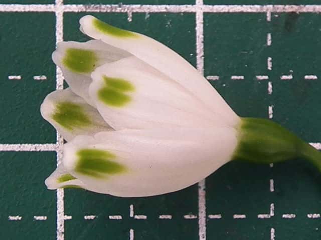 中南欧の原産で野生化している帰化植物。茎は管状。葉は細く線状で、幅約1cm、先端は丸い。花は純白、花被片は6枚、3枚ずつ内側と外側に並ぶ。花冠は鐘状で先には内外に緑色の斑点があり、1個または数個を散形に付けて垂れ下がる。花期は3〜5月。別名:オオマツユキソウ、スズランスイセン