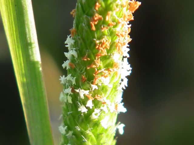 | ▼葯は白色から黄褐色に変わる。 | ▼花軸に多数の小穂が密についている。 | |