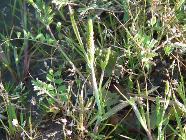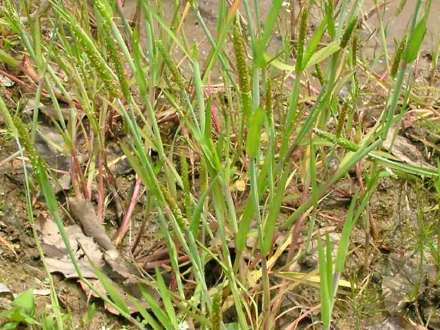 | 越年草 北海道〜沖縄の水田や廃田、休耕水田などに生育し、群生する。茎はやわらかく、叢生。茎の高さ20〜30cm。葉は柔軟・無毛。長さ5〜7cm、幅3〜5mm。葉舌は薄く白色、長さ3〜4mm。花序は穂状、直立し淡緑色、長さ4〜6cm、径3.5mm、多数の小穂を密につける。小穂は広卵形、灰白色ないし灰褐色、長さ2〜2.5mm、1小花からなる。包穎は2枚とも同形・同大で斜上する白色の長い毛がある。護穎は包穎と同長、無毛、背側の基部近くから長さ3mmほどの芒をだす。内穎はない。果実は暗灰色、扁平、長さ1〜1.4mm。花期は4〜6月。(日本イネ科植物図譜) 学名は、Alopecurus aequalis var. amurensis イネ科スズメノテッポウ属 スズメノテッポウ(広義 Alopecurus aequalis)のうち、水田に多く小穂が長さ3〜3.5mmで芒が明らかに小穂外に突き出すものをスズメノテッポウ(狭義 Alopecurus aequalis var. amurensis)とし、 やや乾燥した畑地や路傍に多く、小穂が2〜2.7mmと短く、芒が小穂外にほんの少しだけ出るものをノハラスズメノテッポウ(Alopecurus aequalis var. aequalis)として分ける。 よく似たものにセトガヤがあり、小花の外花穎の先端に0.6〜1cmの芒があり、小穂の外につきでて目立つ。葯は花期の終わりまで白色またはクリーム色。 |