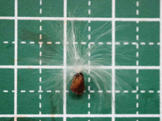 | ▼種髪は長さ1.5〜2cm。 | ▼種子は長さ約5mm。 | ▼種子の縁に翼がある。 |