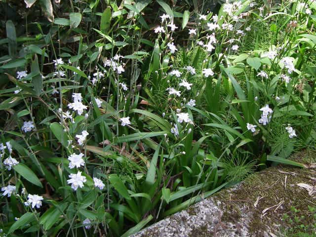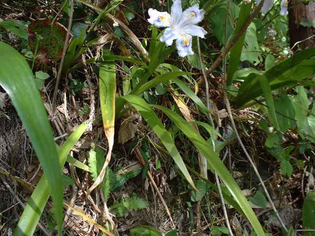多年草 本州〜九州の林内に群生することが多い。古い時代に中国から渡来したともいわれる。葉は長さ30〜60cm、幅2〜3.5cmで光沢のある鮮緑色。花茎は高さ30〜70cmになり、上部で分枝して、淡白紫色の花をつける。花は直径4〜5cmで、朝開いて夕方にしぼむ。外花被片のふちは細かく切れこみ、中央部に橙黄色の斑点ととさか状の突起があり、そのまわりに淡紫色の斑点がある。内花被片はやや細く、先は浅く2裂する。花柱の裂片の先は2裂し、さらに細かく裂け、花弁のように見える。3倍体植物なので結実しない。花期は4〜5月。(野に咲く花) 学名は、Iris japonica アヤメ科アヤメ属 |