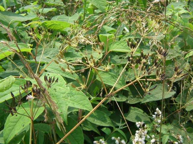 多年草 北海道〜九州の山の谷間に生える。根は太く肥大する。茎は中空で高さ1m内外に達し上部は分枝する。葉は2〜3回羽状で軟かく、下面脈上に剛毛が散生する。花は白色で、花序の周辺部の花は外方の花弁が大きくなっている。小総苞片は数個あり長さ2〜5mmで反曲する。果実は小散形花序に5〜11個がみのり、長さ6〜8mm、若い時は花柄の先に剛毛からなる小冠があり、披針形平滑で熟すと黒くなる。花期は5〜6月。(原色日本植物図鑑) 学名は、Anthriscus sylvestris セリ科シャク属 |