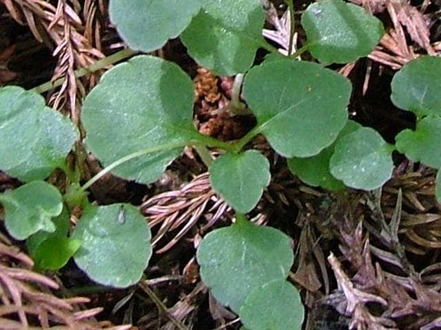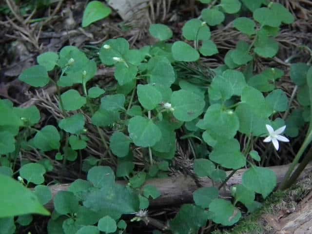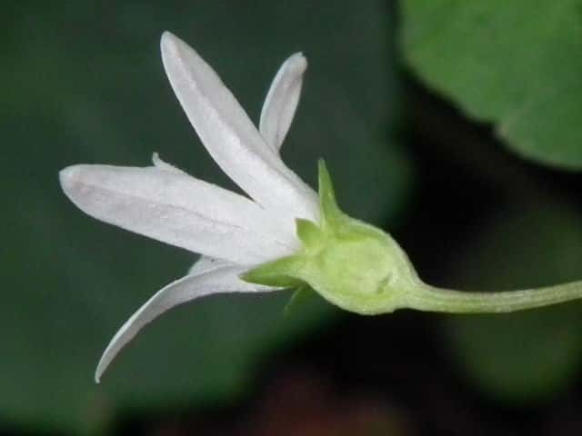 多年草。 北海道〜九州の山地の木陰に生える。高さ約10cm。葉は比較的上部にまばらに互生し、長さ5〜15mmの柄があり、卵円形で長さ8〜25mm、表面にやわらかい短毛を散生し、ふちに粗い鋸歯が数個ある。茎頂または上部の葉腋から花柄を立て、白色の鐘形の花をつける。花冠は長さ5〜8mm、先は5深裂する。雄しべは5個。果実は細い弱々しい柄の先に上向きにつくが、熟してくるとしだいに下向きとなる。花期6〜8月。(山に咲く花) 学名は、Peracarpa carnosa キキョウ科タニギキョウ属 |