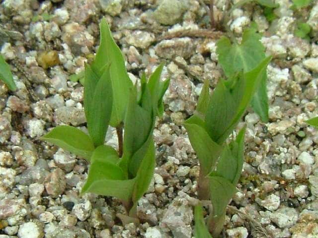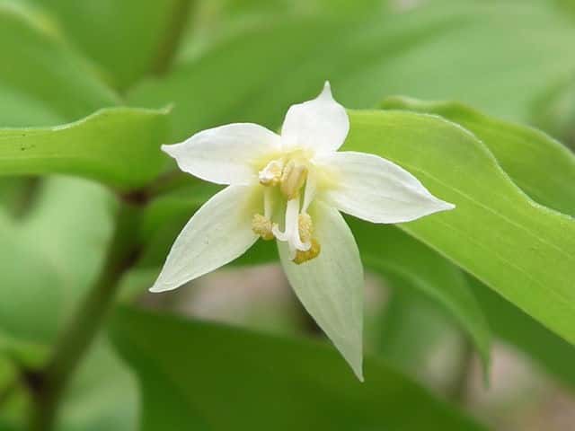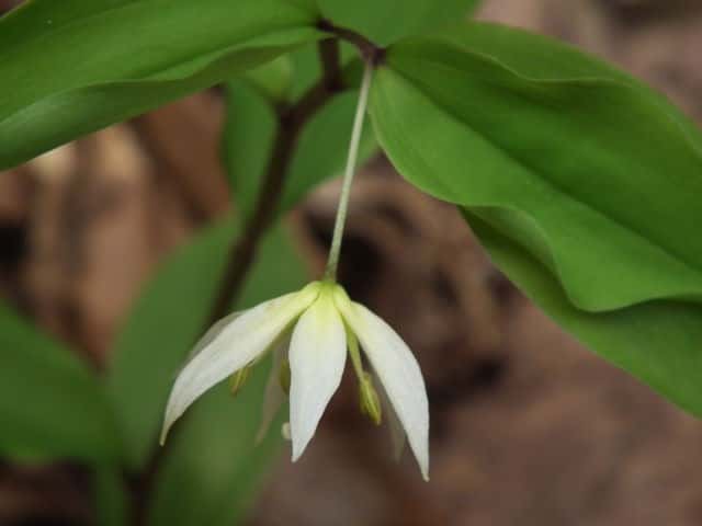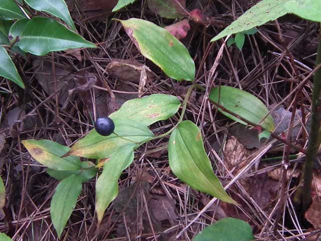 | 多年草 本州〜九州の山野の林内に生える。高さ20〜35cm。茎はまれに分枝する。葉は長さ4〜7cm、幅2〜3cmの楕円形〜長楕円形で先は尖る。茎の先に白色の花が1〜2個斜め下向きにつく。花被片は長さ1.2〜1.6cmの披針形で、6個が広鐘形に開く。雄しべは6個あり、葯は花糸の半長。子房は花柱の半長。液果は黒く熟す。花期は4〜6月。(野に咲く花) 学名は、Disporum smilacinum イヌサフラン科ホウチャクソウ属 |