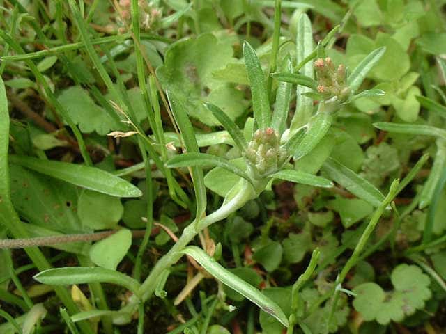 | 多年草 日本全土の山野の道ばたや荒れ地に生える。高さ15〜30cm。匐枝を出して増える。根生葉は花期にも残り、長さ2.5〜10cmの線状披針形。表面は薄く綿毛が生え、裏面は綿毛が密生して白っぽい。茎葉は線形で少ない。頭花は茎の先に丸く集まり、花序の下に披針形の苞葉が放射状につく。総苞は長さ約5mmの鐘形。総苞片は暗紫褐色を帯びる。そう果の冠毛はばらばらになって落ちる。花期は5〜10月。(野に咲く花) 学名は、Euchiton japonicus キク科チチコグサ属 チチコグサの仲間 |