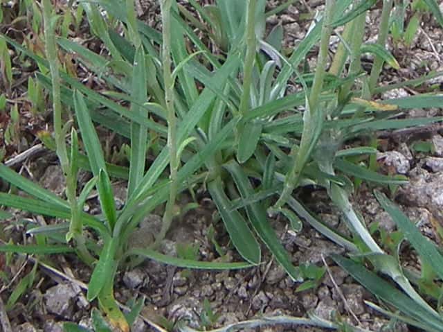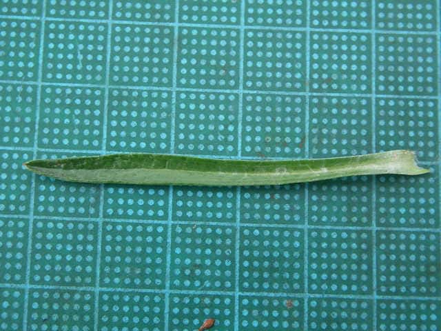 | ▼果実には上向きに乳頭状突起がある。 | ▼葉は線形。 | ▼葉の基部は茎を抱いている。 |