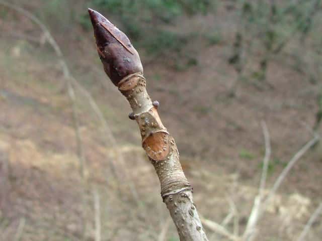 | 落葉高木 北海道札幌市以南〜九州の山地渓流沿いの肥沃地に生える。高さ20〜30m、直径2mになる。樹皮は黒褐色。大きな波形の模様がある。はじめはなめらかだが、大木では樹皮が大きく割れてはがれ落ちる。枝は灰褐色。はじめ赤褐色の長い軟毛があるが、すぐに落ちる。葉は対生。掌状複葉で、葉柄は長さ5〜25cm。小葉は5〜9個。中央の小葉が最も大きく、長さ13〜30cm、幅4.5〜12cm、先は急に鋭く尖り、基部はしだいに細くなる。側脈は20〜30対あり、ほぼ平行。裏面は脈上に毛があり、脈腋に毛叢がある。少葉柄はない。雌雄同株。一つの花序に雄花と両性花がまじる。枝先に長さ15〜25cmの円錐花序を直立し、直径1.5cmの花を多数つける。ほとんど雄花で両性花は花序の下部につく。花弁は4個、白色で基部には淡紅色の大きな斑紋がある。雄しべは7個、花から長くつきだし、先は上向きに曲がる。萼片は5個。雌しべは1個、雄花では退化している。果実はさく果。直径3〜5cmの倒卵状球形で表面にはいぼ状の突起が多い。9月に熟すと3裂し、1〜2個の大形の種子をだす。種子は褐色で下半部は大きなへそになる。結実には豊凶があり、隔年ごとの傾向がある。花期は5〜6月。 冬芽の頂芽は大きく、長さ1〜4cm。側芽は小さく、ほとんど発達しない。芽鱗は樹脂でべとべとしている。芽鱗痕は環状。葉痕は倒卵形で大きい。維管束痕は5〜9個。(樹に咲く花) 学名は、Aesculus turbinata ムクロジ科トチノキ属 |