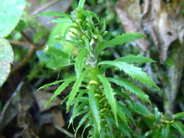 | 常緑シダ植物 各地の林床に群生し、スギの幼苗に似る。茎は地表で短く斜上して、直立する。葉は倒披針形〜長楕円状披針形、下部は短い葉柄となり、縁に不整な鋭鋸歯がある。胞子嚢群は上部の葉腋に1個ずつつき、黄色に熟して横に裂けて胞子を出す。茎の上部に無性芽ができ、これが落ちて新植物となる。胞子期は7〜9月。 葉の幅によってホソバトウゲシバ(2mm以内)、ヒロハノトウゲシバ(2〜3mm)、オニトウゲシバ(3〜5mm)の3型が分けられることもあるが、連続的であるとして最近ではまとめられることが多い。 学名は、Lycopodium serratum ヒカゲノカズラ科ヒカゲノカズラ属 |
