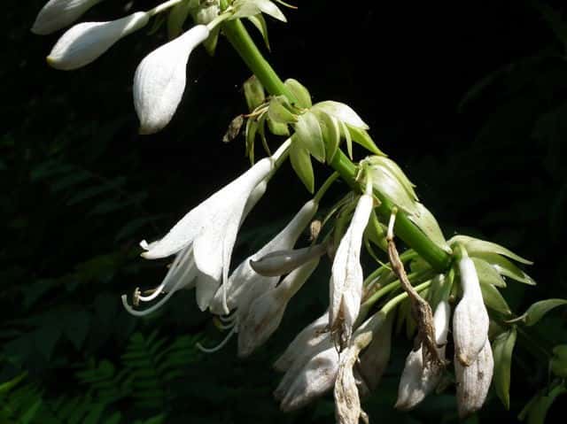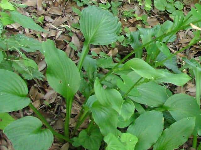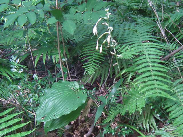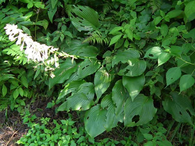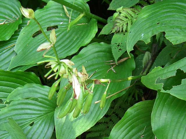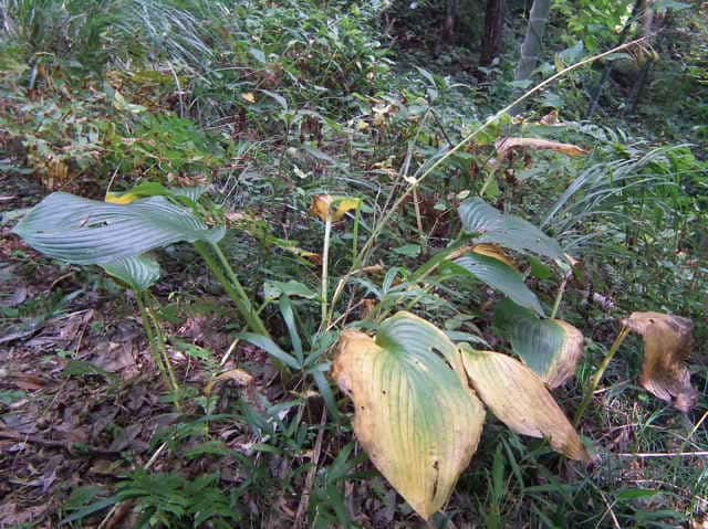 | 多年草 北海道南西部〜九州の山地の草原や林縁に生える。葉身は卵形〜楕円形、長さ30〜40cm、ふつう緑色、ときに裏面が帯白色、裏面の脈は隆起して、凹凸でざらつく。花茎は高さ50〜100cm、葉より低いものから高いものまである。苞は花茎の伸びるときから開出するので、数個の苞を上から見ると星形に見える。個々の苞は長楕円形、平ら、開花時には花茎と直角になってしばしば白っぽくなる。花被は長さ4〜5cm、白色または淡紫色、ときに淡紅紫色をおび、透明線は広筒部(花筒上部)にある。果実は胞背裂開するさく果で、種子は扁平な楕円形で片側に翼がある。別名トウギボウシ。花期は6〜8月。(日本の野生植物) 学名は、Hosta sieboldiana キジカクシ科ギボウシ属 太平洋側に生えるものをオオバギボウシ、日本海側に生えるものをトウギボウシとする説もあるが、異なる分類群とはしないほうがよいとされる。 |