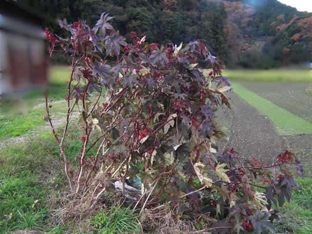 | 1年草 アフリカ北東部原産。中国から平安時代初期に、アメリカから江戸時代末期に導入された。西日本を中心に逸出し、野生化している。全体無毛で通常暗紫色を帯びる。茎は円柱形で直立し、まばらに分岐して高さ2mに達する。葉は大型で掌状に5〜11に裂け、縁に鋸歯があり、長い柄で互生する。茎の頂と葉腋に長さ20cmほどの花序を付け、雌花を上部に、雄花を下部につける。さく果には通常刺があり、中に長さ13mmほどで光沢のある3種子を含む。花期は秋。(日本帰化植物写真図鑑) 学名は、Ricinus communis トウダイグサ科トウゴマ属 |