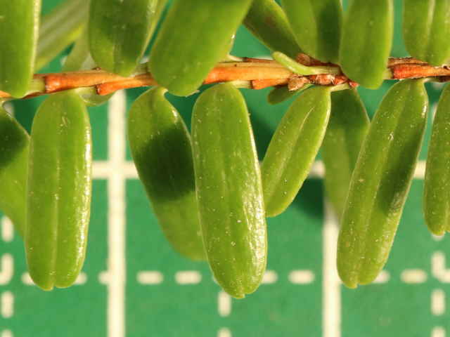 | ▼葉の先端は凹む。 | ▼裏面には白い2本の気孔帯がある。 | ▼長い葉は長さ約1.5cm。 |