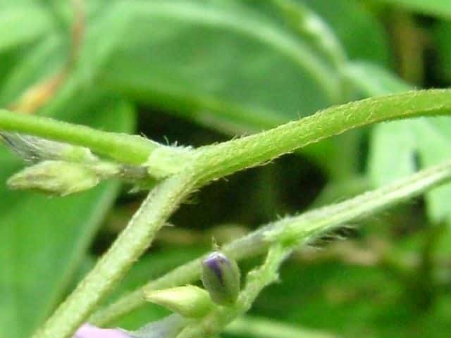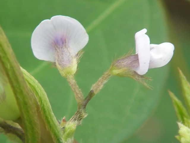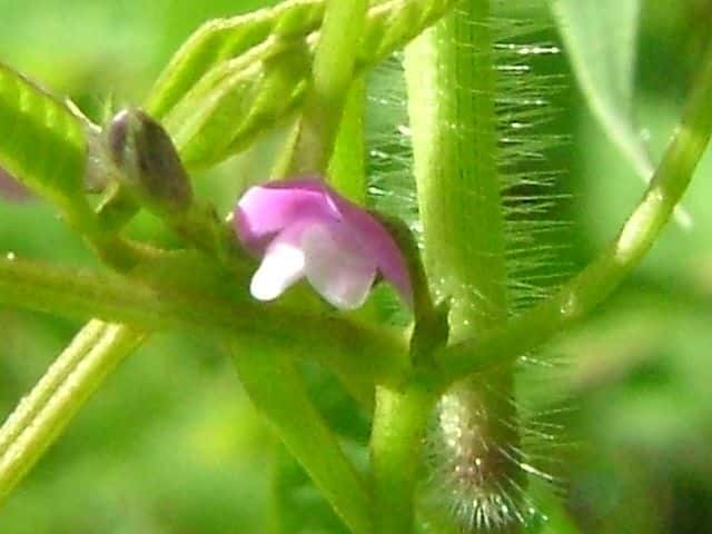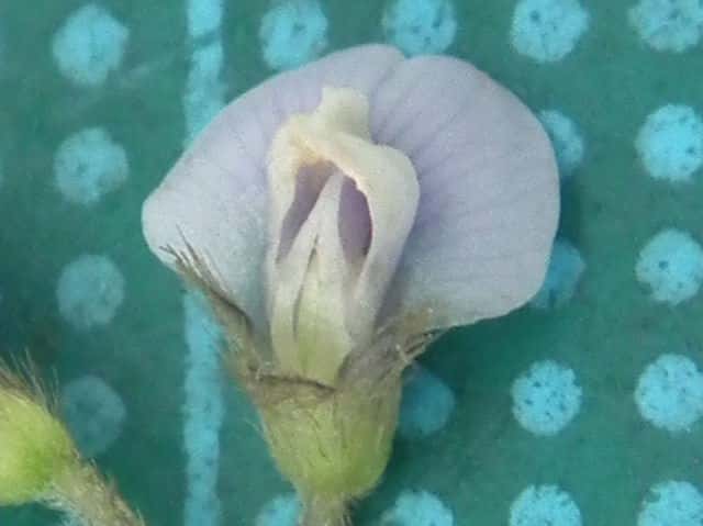 | ▼旗弁の幅は約5mm、長さ約3mm。 | ▼萼に毛が密生する。 | ▼花序に5個の花がある。 |