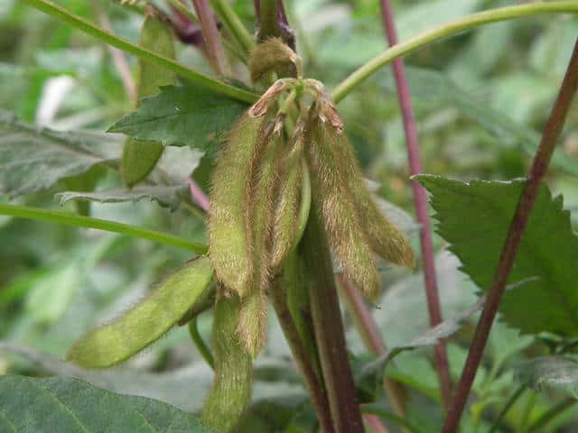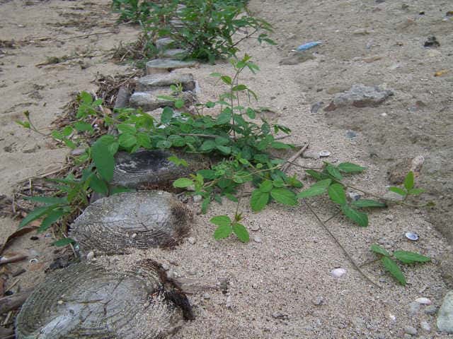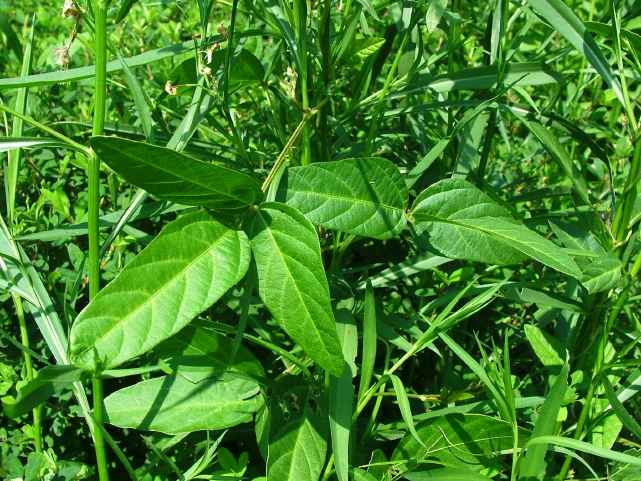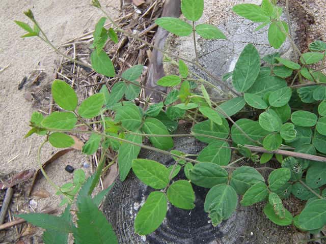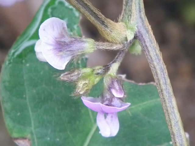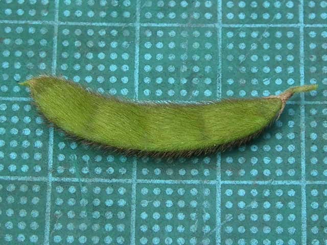 | つる性1年草 日本全土の野原や道ばたなどに生える。茎には下向きの粗い毛がある。葉は3小葉からなり、両面とも毛がある。小葉は長さ2.5〜8cm、幅1〜3cmの狭卵形〜披針形。花は淡紅紫色で長さ5〜8mm、葉腋に3〜4個ずつつく。豆果は長さ2〜3cmで淡褐色の毛が密生し、2〜3個の種子が入っている。花期は8〜9月。(野に咲く花) 学名は、Glycine max subsp. soja マメ科ダイズ属 |