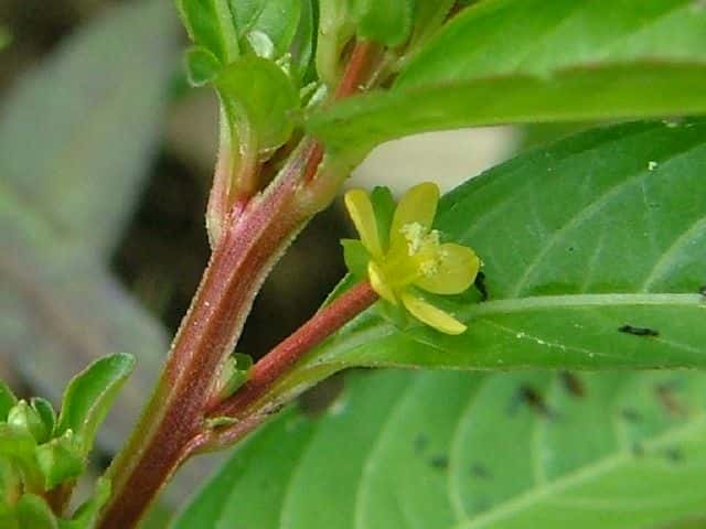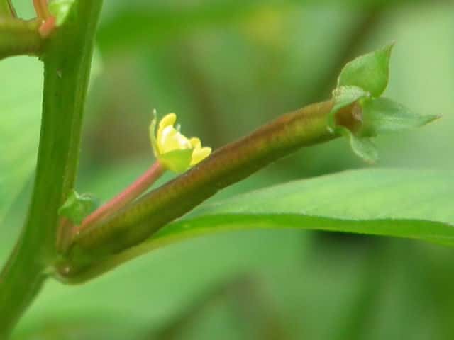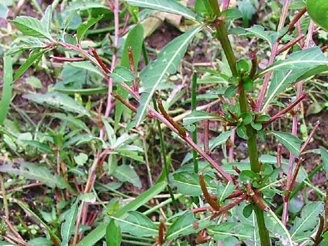 | 1年草 北海道〜琉球に分布する。水田や湿地に多い。茎は直立して、多くの枝を分け、稜線があり、紅紫色をおびて、高さ15〜100cmになり、無毛かときに短毛がある。葉は互生し、短い柄があり、披針形〜長楕円状披針形、全縁で、長さ1〜10cm、幅0.4〜2.5cm。花は腋生して、柄はなく、基部に2個の小苞がある。萼裂片は卵状披針形、長さ1.5〜3mm。花弁は黄色で、萼より短い。雄しべは4個。花柱は1個。花床はほぼ無毛。さく果は線状円柱形で浅い4〜5稜があり、帯紫色、長さ1.5〜3cm。種子は紡錘形、長さ0.8〜1.4mm。花期は8〜10月。(日本の野生植物) 学名は、Ludwigia epilobioides アカバナ科チョウジタデ属 似た花にウスゲチョウジタデがあり、茎は直立して多くの枝を分け、葉とともに細毛が多い。葉は秋期紅葉しない。花弁は萼片より長く、花床には白い毛が密生する。花弁の幅が広く、隣の花弁との隙間ができない。萼片は普通5枚で長さ3〜4mm。果実の各室にある種子が2列とされる。 帰化種のヒレタゴボウは葉のつく下部に翼があり、花が直径約2.5cmと大きい。 |