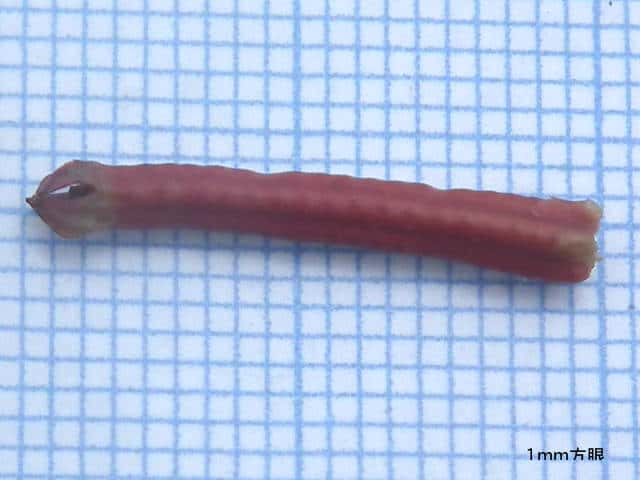 | ▼果実は長さ約8mm、先端に萼が残る。 | ▼果実の先端に残った萼。 | |