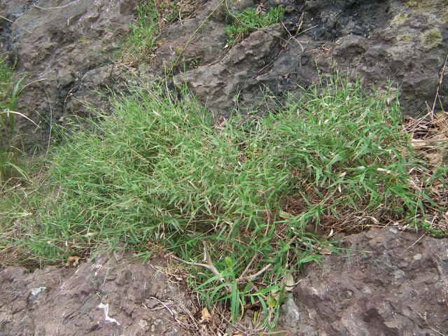| 多年草 北海道〜九州の海岸の乾燥した岩場に生育し、やや群生する。茎は高さ30〜60cm、短い根茎があり、越冬芽は茎の基部に着生し、卵形の堅い鱗片に包まれて地表にある。茎は直立・叢生し、細いが堅い。葉は長さ3〜8cm、幅3〜6mm、葉鞘とともに両面にまばらな長い毛を生じる。葉舌は短く縁に毛がある。花序は円錐状、長さ4〜8cm。小穂は披針形、暗紫色を帯び、2〜4小花からなり、芒とともに長さ10mm。第1苞穎は狭卵形、長さ1.5mm、第2苞穎は広披針形、3mm。果実は挟披針形、鈍頭、乳白色、長さ4mm。花期は8〜9月。(日本イネ科植物図譜) 学名は、Cleistogenes hackelii イネ科チョウセンガリヤス属 |
