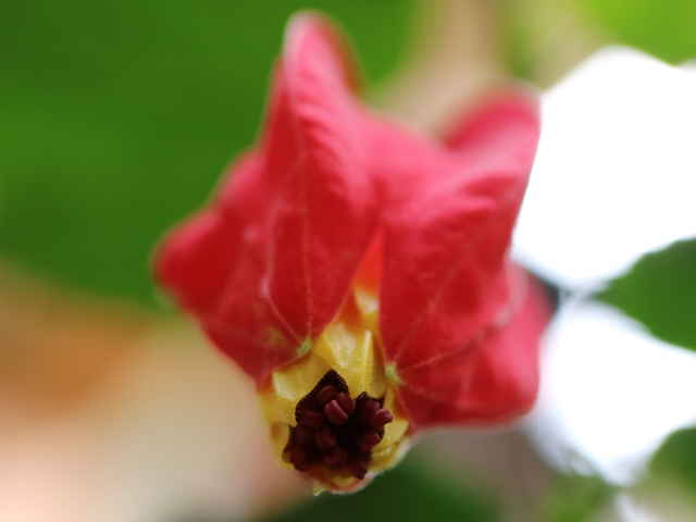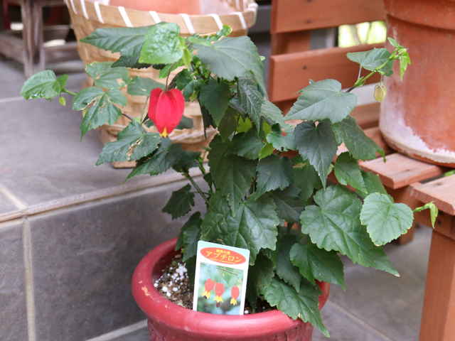 | 常緑低木 ブラジル原産の半つる性木本。枝は細く軟弱で、他物によりかかって成長し、枝先は垂れる。葉は長三角形~心形で、鋸歯があり、葉柄があり、互生する。葉腋に長い花柄のある花を吊り下げ、下向きに咲かせる。花弁は淡黄色の5弁花で、赤い5稜がある袋状の萼からやや突き出す形で咲く。花からは褐色の雄しべがついた花柱が突き出る。別名チロリアンランプ、アブチロン。 花期は6〜10月。(植物写真鑑) 学名は、Abutilon megapotamicum アオイ科イチビ属 |